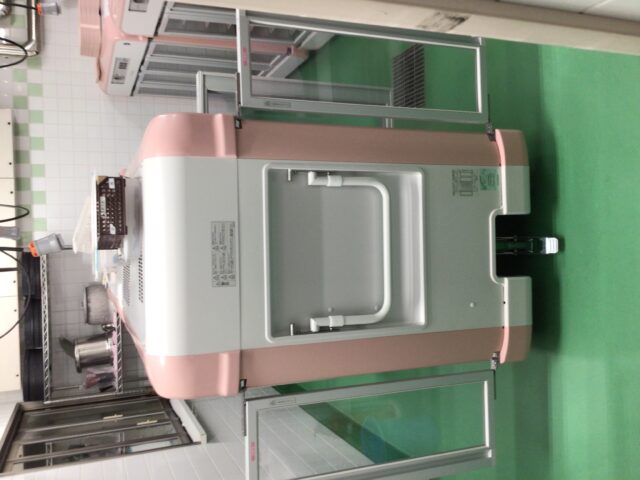 かわいいピンク色の車体で、コンパクトですが中は広く、内装は清潔なステンレス製の温冷配膳車です。