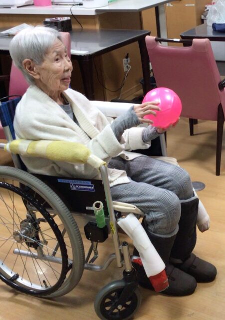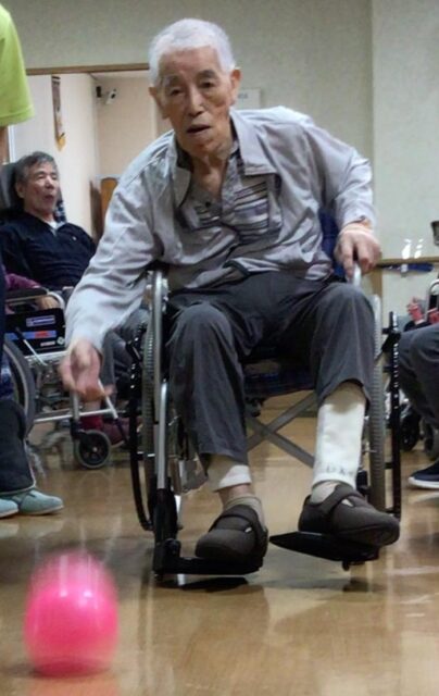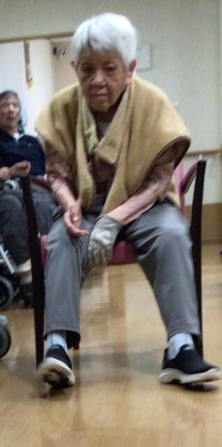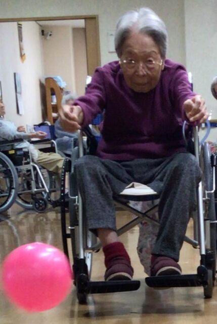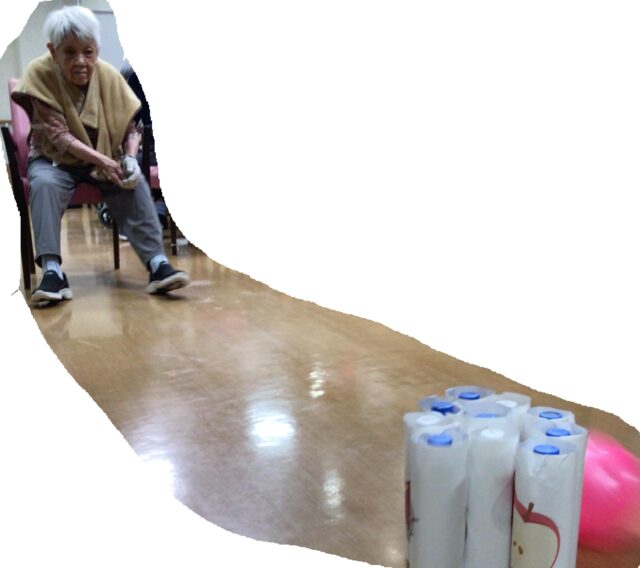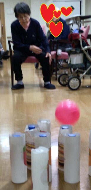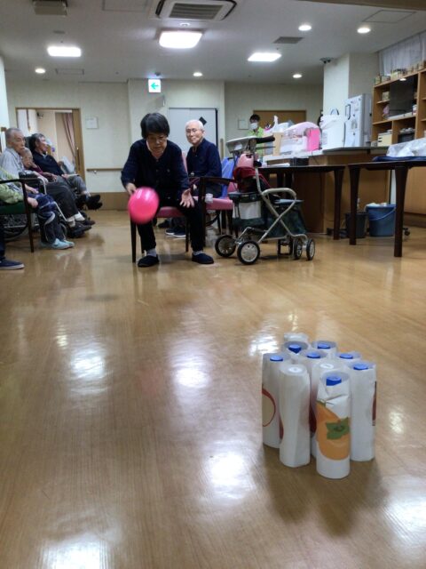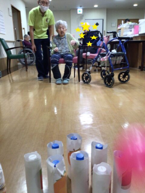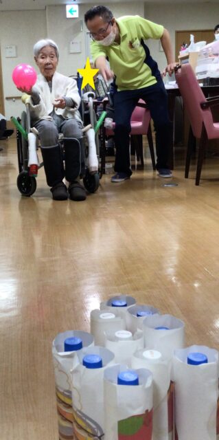 ペットボトルに秋の味覚(かき、さつま芋、サンマなど)を貼って秋の雰囲気を味わってもらいました。